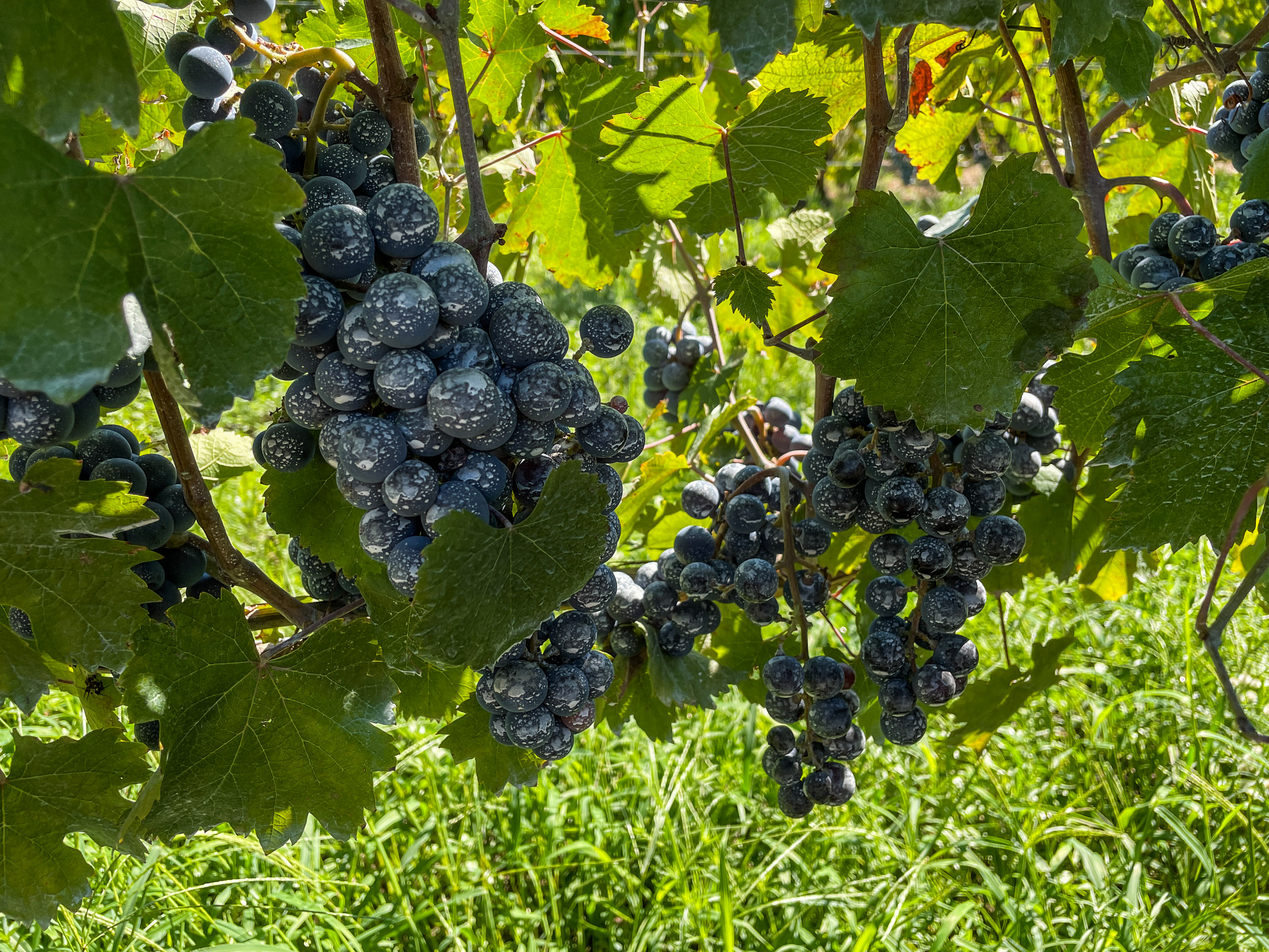 Both grapes do fairly well in the hot Mediterranean sun, which is modulated by the influence of the nearby ocean. Depending on the site, growers will sometimes use a spray of water mixed with kaolin clay as a sort of susncreen for the ripening clusters, the remains of which you can see in the Piedirosso photograph above.