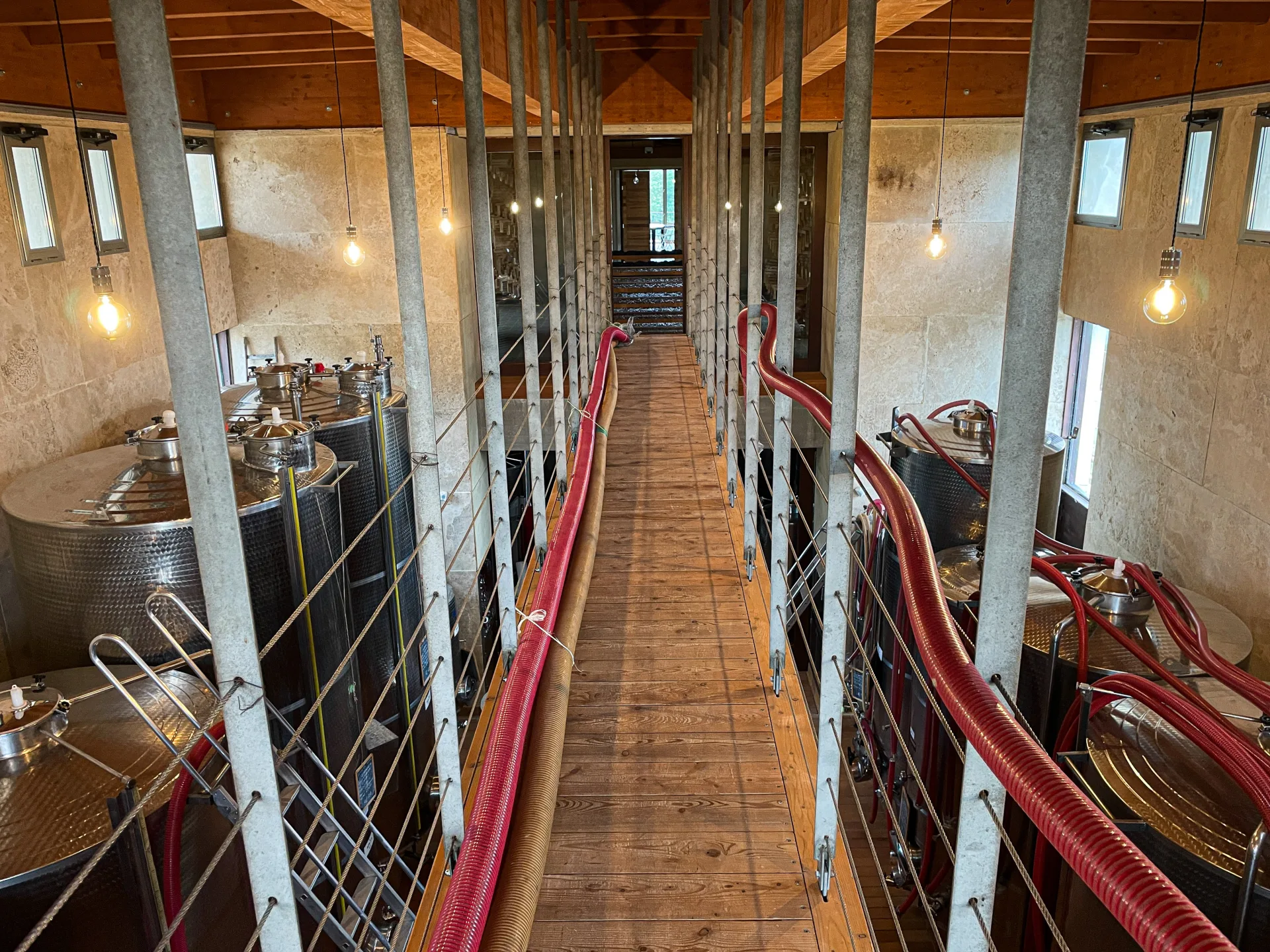 Windows open in the cellar automatically when the temperature reaches 22˚ C / 71˚ F. The warm air escaping the windows draws in air from pipes in the floor that extend down the hill and open out onto the green fields below the winery. As air passes through these pipes buried deep in the earth, it cools and emerges in the cellar to passively regulate the temperature.