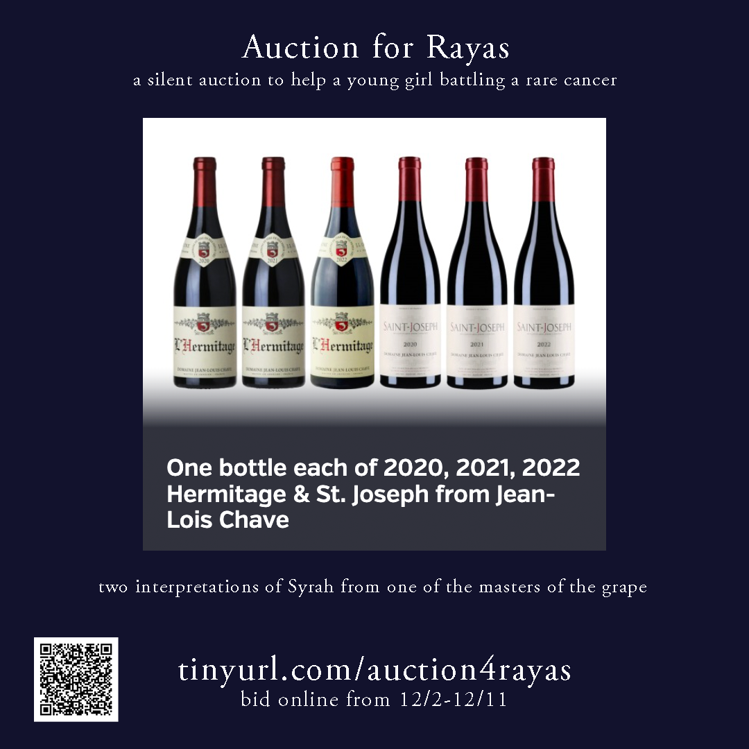 Here are just a few of my favorite lots (in case anyone is still doing holiday shopping for me – ha ha), including a stunning lot of 6 pristine wines from Rayas’ namesake Château Rayas, donated by the winery’s importer Martine’s Wines.